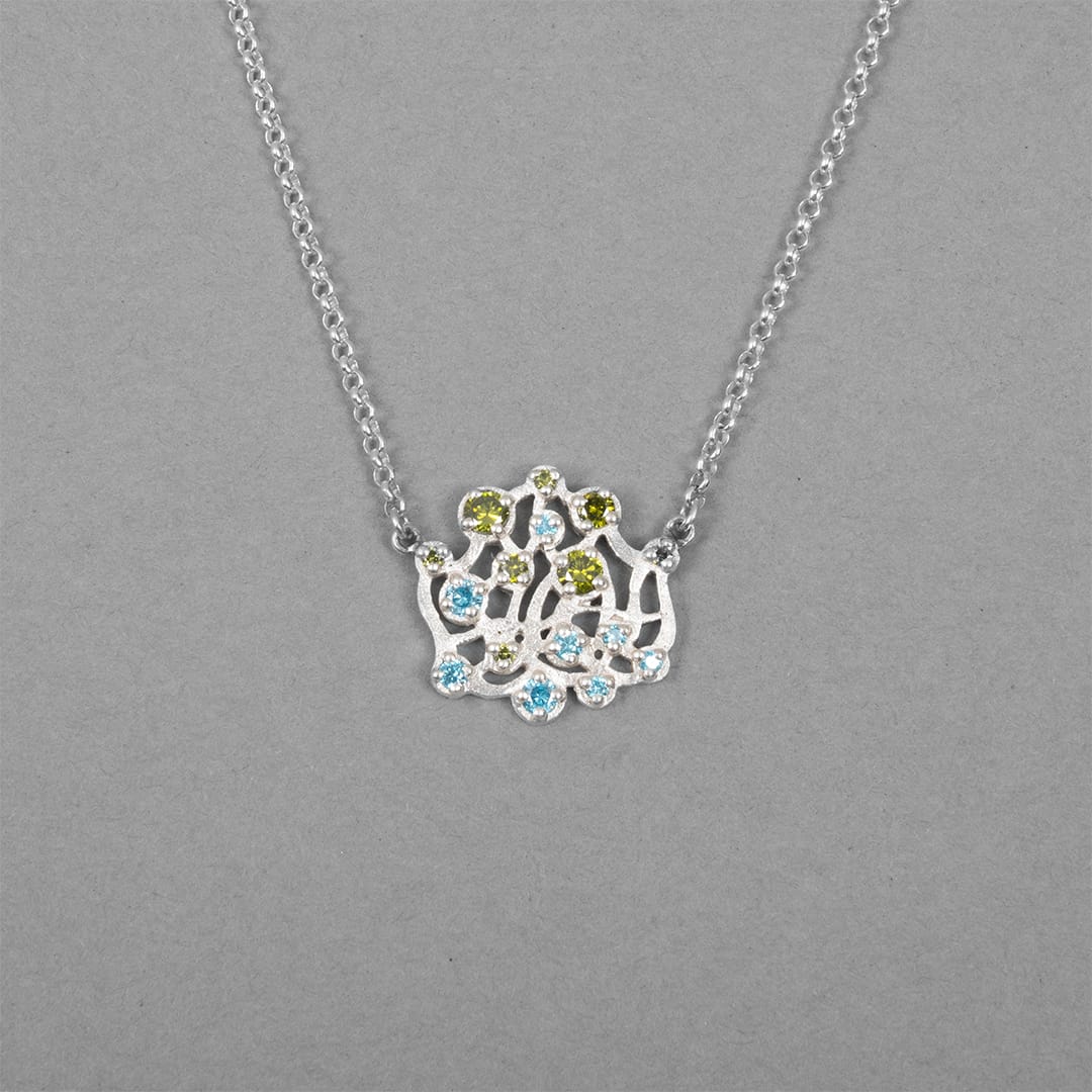 Halssmycket minner om en försommardag vid älven där de gnistrande peridoterna och kubiska zirkonierna symboliserar de nyutslagna björklöven och de blå topaserna återspeglar vattenspegeln.