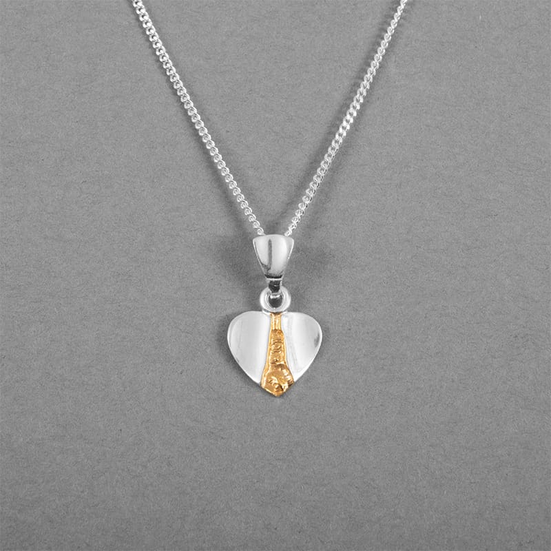 Silver heart necklace including silver chain. The pendant is shaped like a heart, in the center of the heart runs a gold-plated streak.