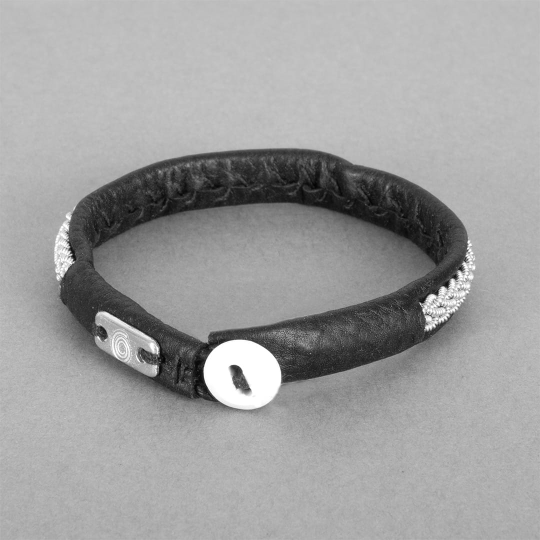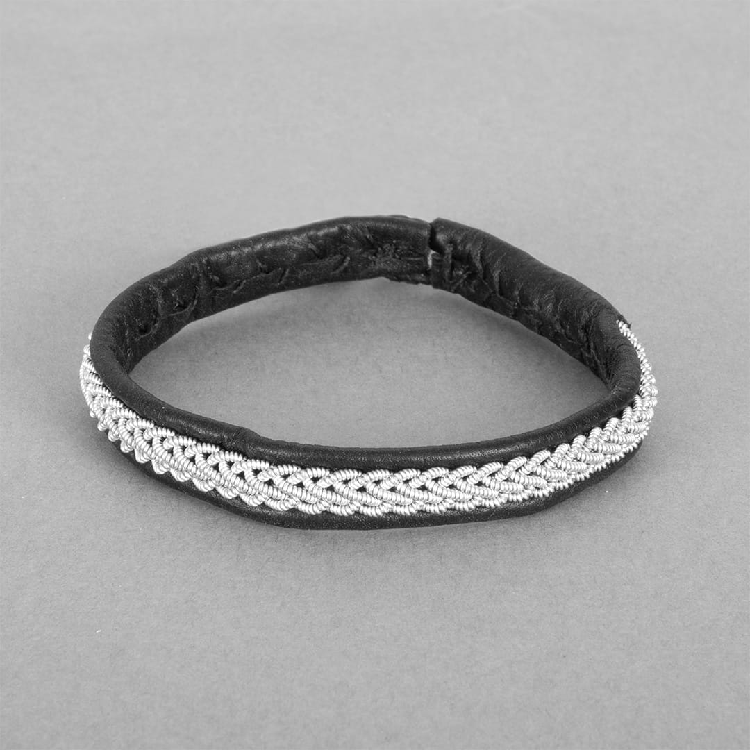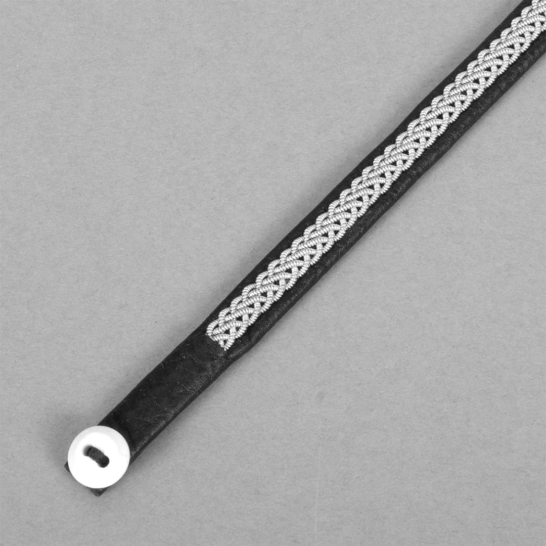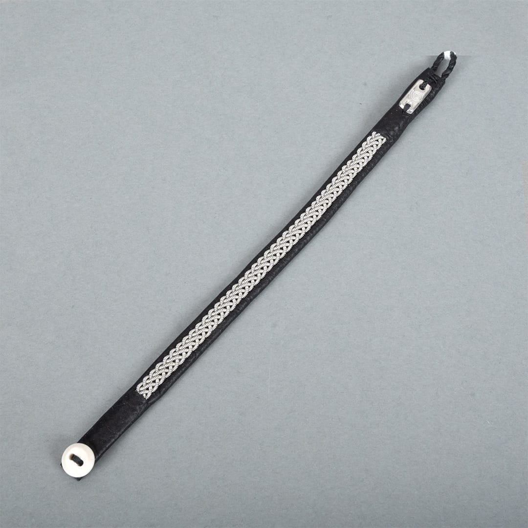 Pewter bracelet Snowmobile tracks, pewter bracelet with pewter wire braid, the braid is sewn onto vegetable tanned reindeer leather. Width approximately 0.8 cm. Reindeer horn button and reinforced loop. A handicraft from Norrbotten.