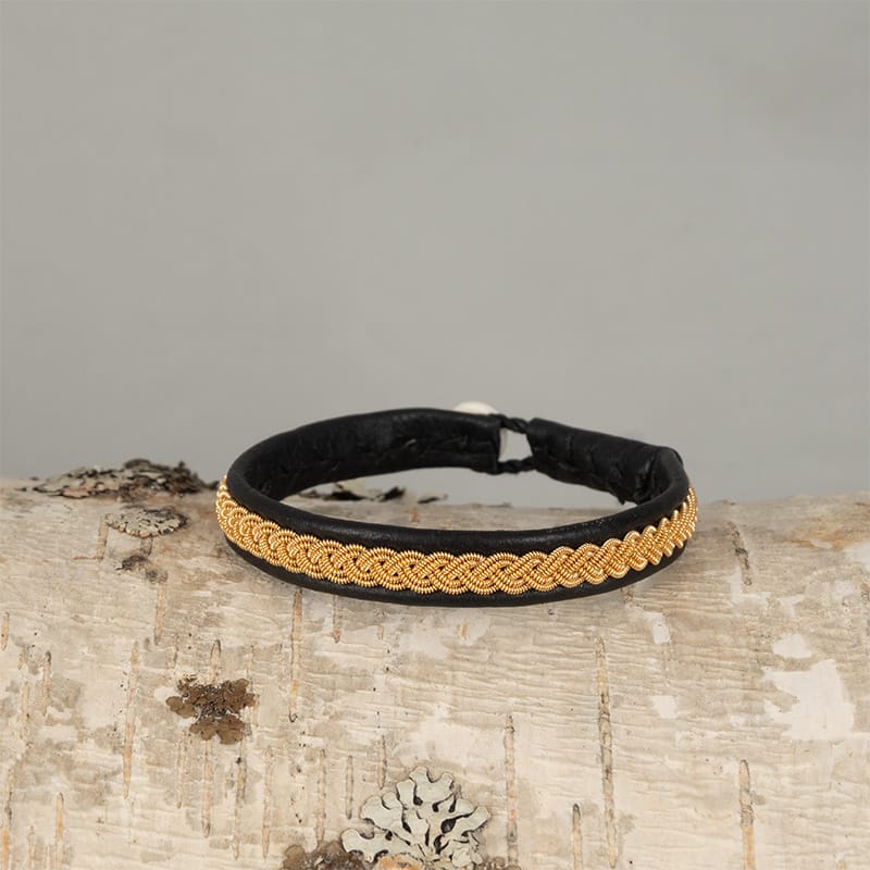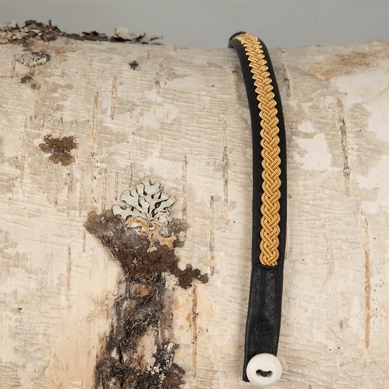 Tennarmbandet Classic Gold, en traditionell fläta med en extra exklusiv känsla. Guldpläterad koppartråd på svart eller mörkbrunt renskinn med renhornsknapp. Bredd cirka 0,9 cm.