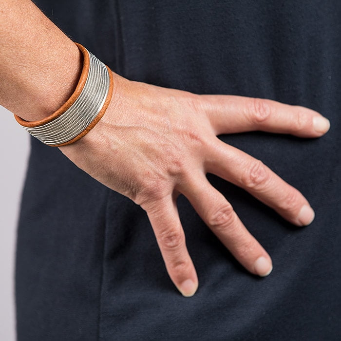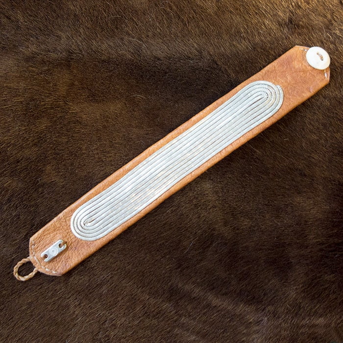 Tennarmbandet New Style Bred – med platt tenntråd i tio rader på renskinn med renhornsknapp. Bredd cirka 2,1 cm.